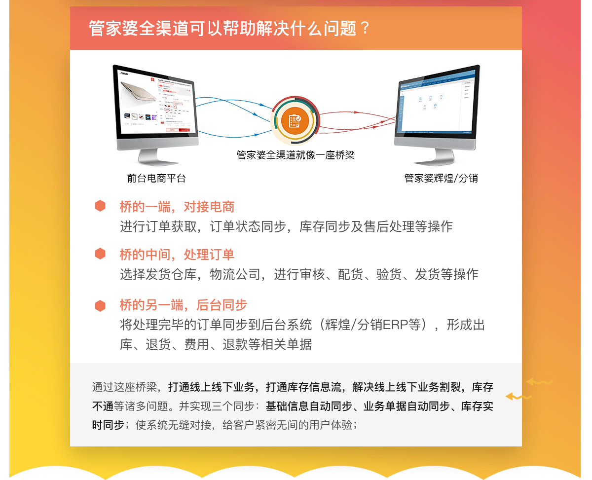 是一個專業的電商業務管理系統,既可以對接電商平臺,處理電商發貨業務,又可以深度對接管家婆進銷存軟件,使線上線下業務緊密結合,協同互補,助力傳統企業開展電商全渠道業務。